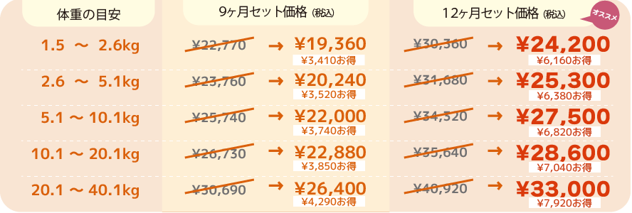 | 基本コース 中年齢以上や食欲が増えた・痩せてきた子向け |